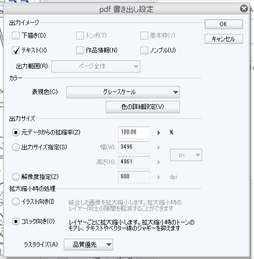 いぬ On Twitter Clip Studio Paintからpdfやe Pub形式の書き出し で マンガ原稿を縮小して出力するときは 拡大縮小時の処理 で イラスト向き ね あと 色の詳細設定 で レイヤーに付与されたトーン効果を有効 をoff Http T Co Wlnov1ctbu